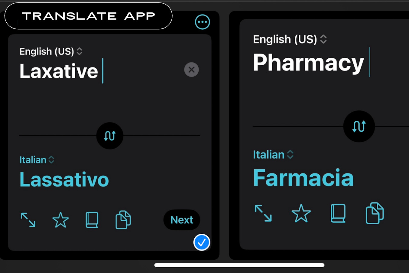 I pull out my phone and punch “laxative” into the translator app. The Italian term “lassativo” appears and I turn it to face the clerk.